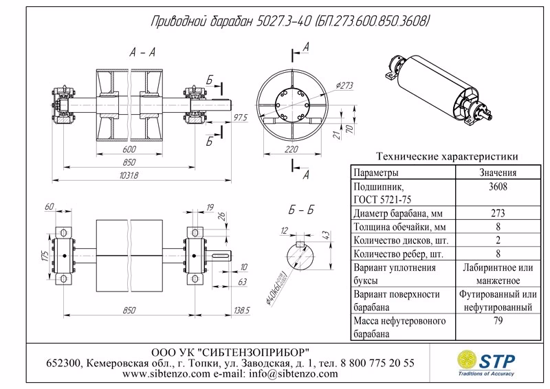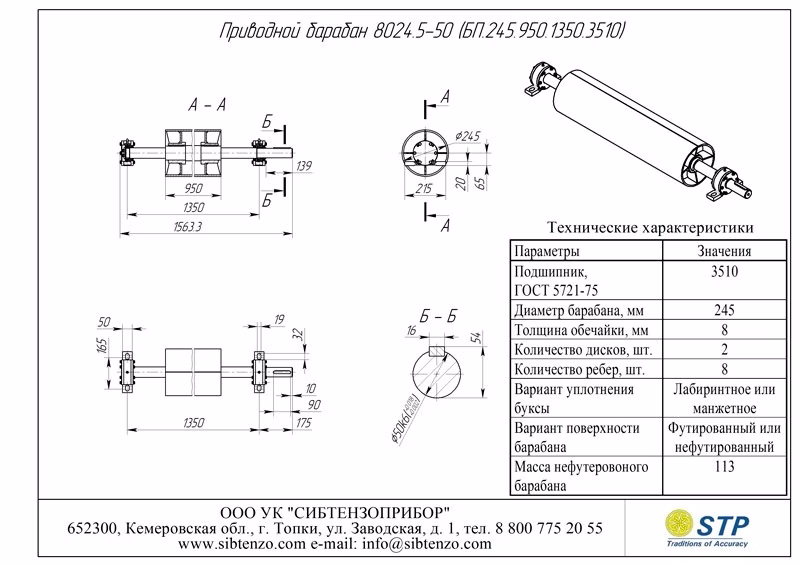 Шир. ленты В, мм Типоразмер приводного барабана Допуст. нагрузка Sб, даН Условное обозначение подшипника Размеры, мм Масса, кг Чертеж