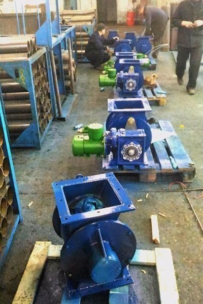 Питатель шлюзовый во взрывозащищенном исполнении из нержавеющей стали производительностью 3 м3/час. Материал транспортиро-вания угольная пыль. Входной фланец Ø150 мм, выходной фланец 200х200 мм.